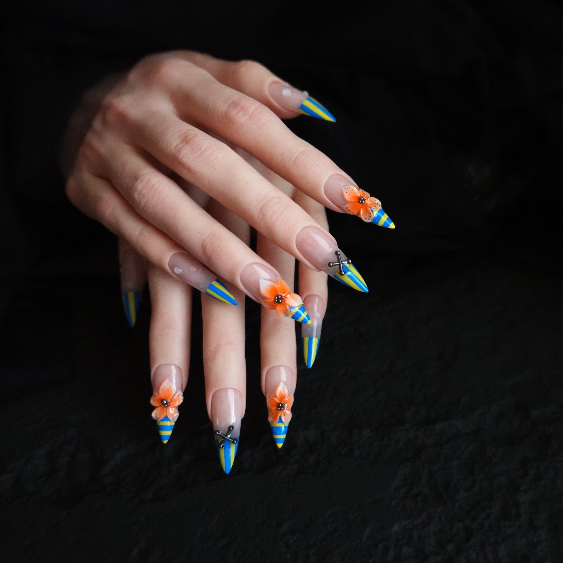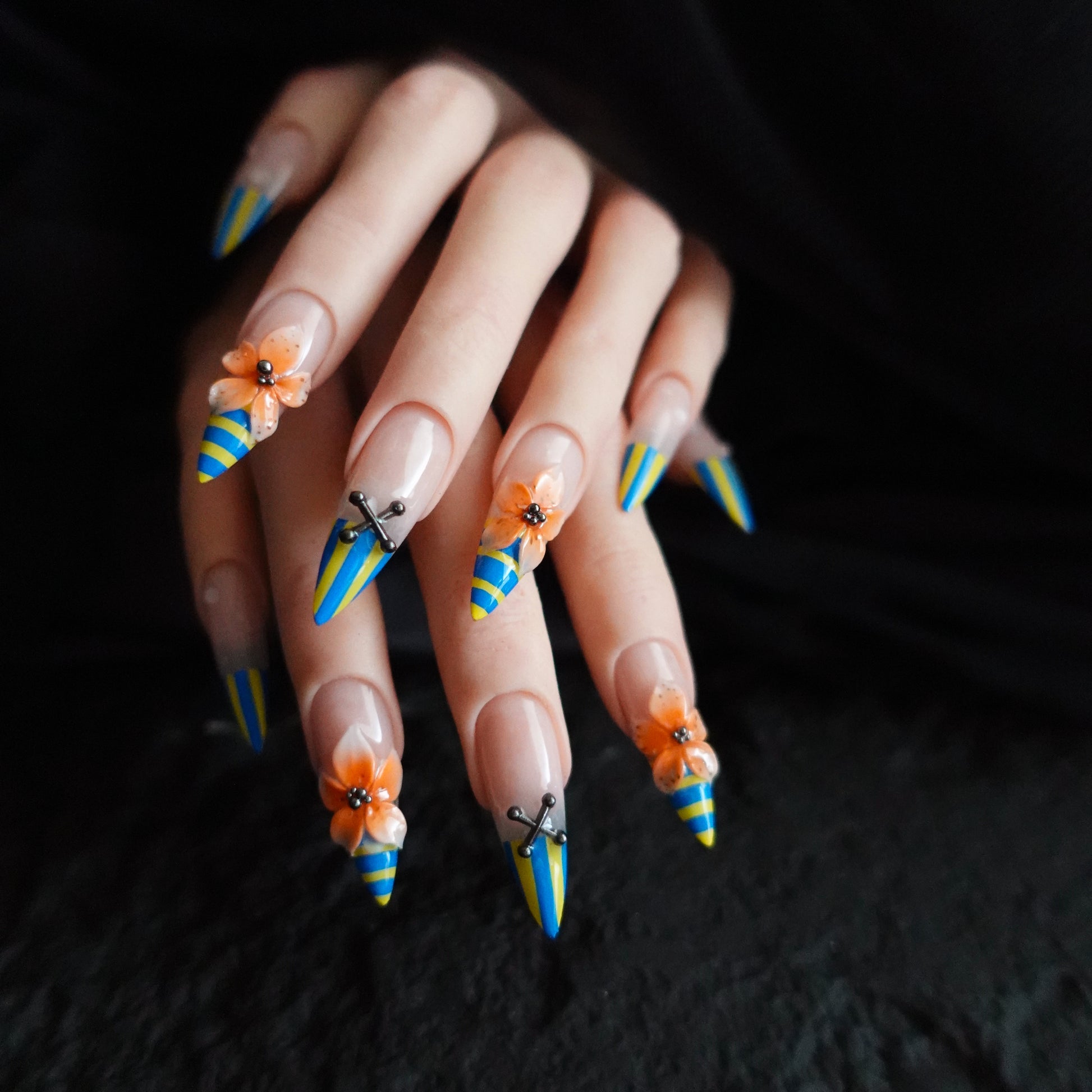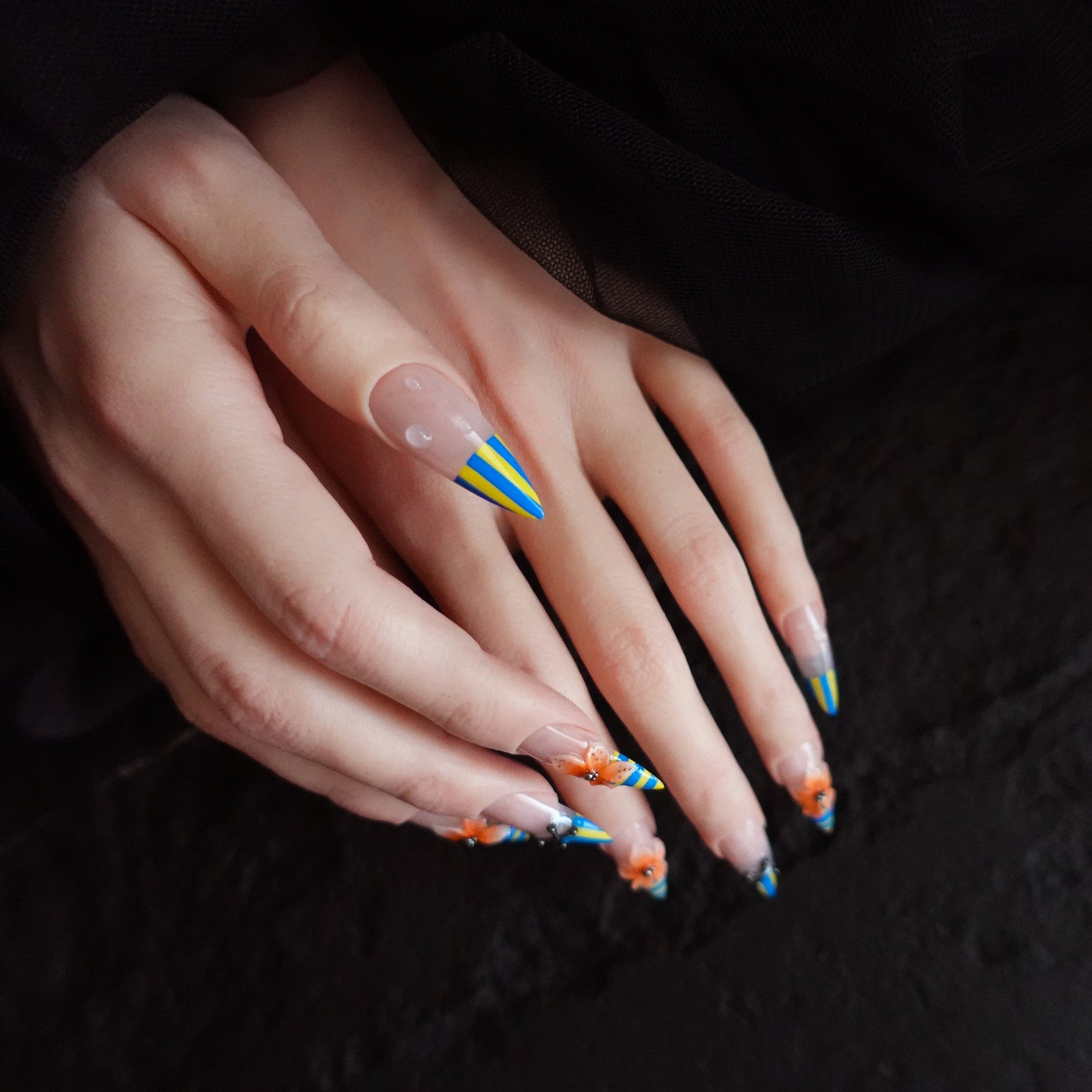 ✨ Features: • 100% Handcrafted & Made-to-Order • Cobalt & lemon striped French tips with crisp lines • Hand-sculpted 3D peach blossoms with crystal centers • Dew-drop gel accents and gunmetal bar hardware • Smooth high-gloss finish • Color Palette: Cobalt Blue, Lemon Yellow, Peach, Dove Grey, Gunmetal • Shape: Long Stiletto (customizable) • Lightweight, durable, and reusable with proper care • Sealed with a glossy protective gel topcoat