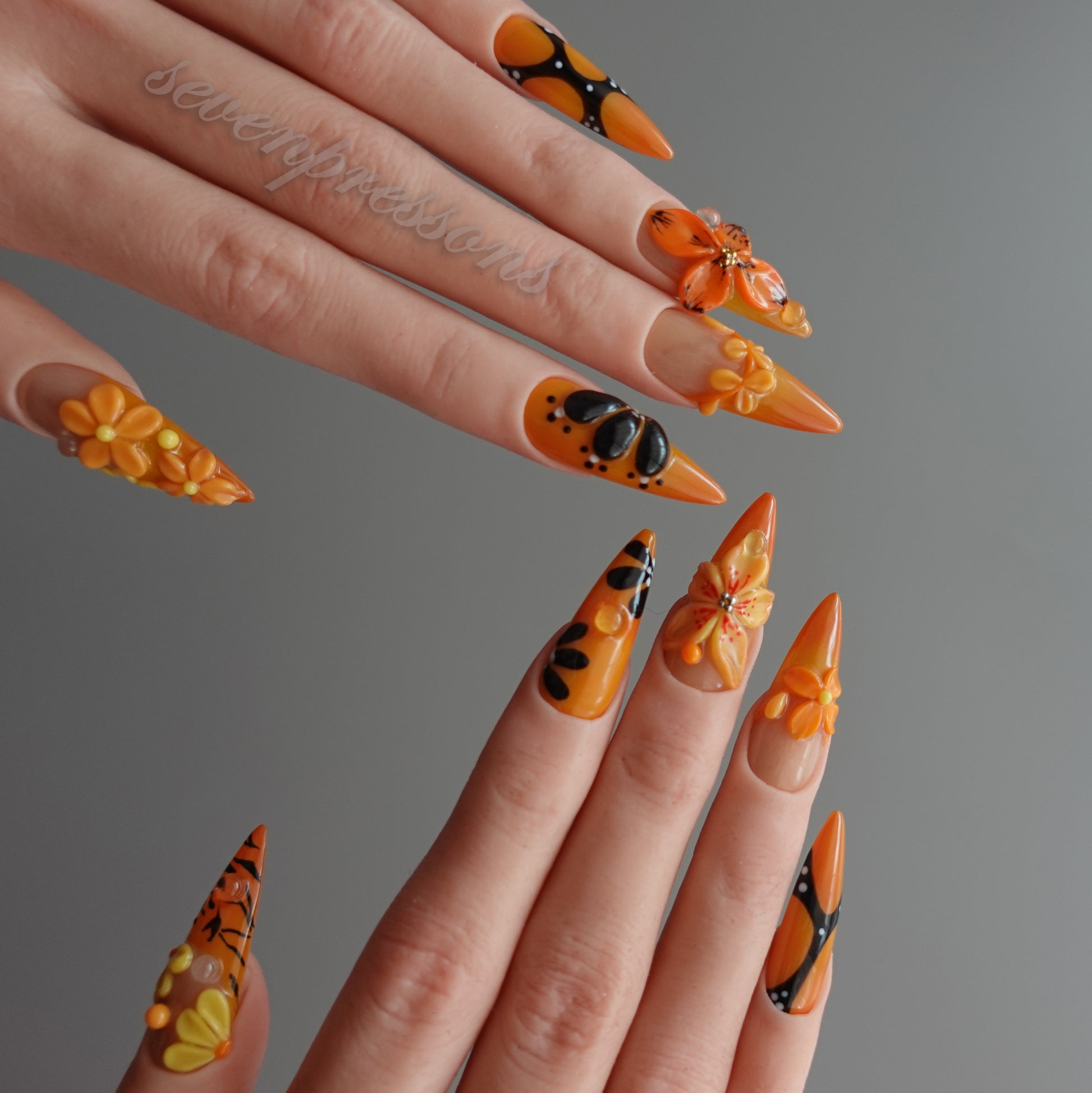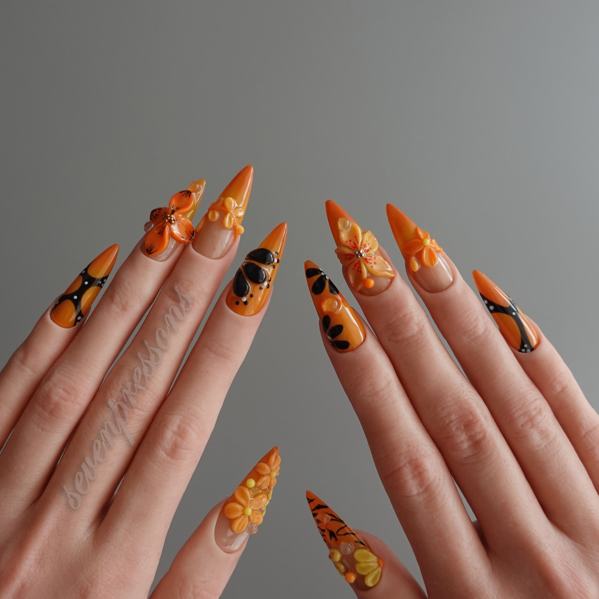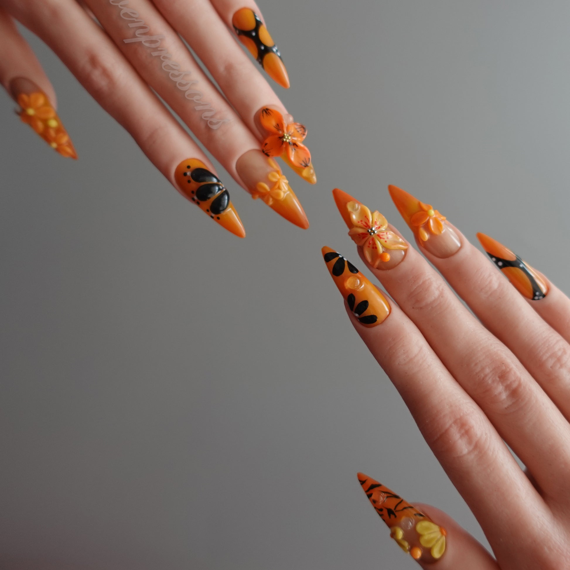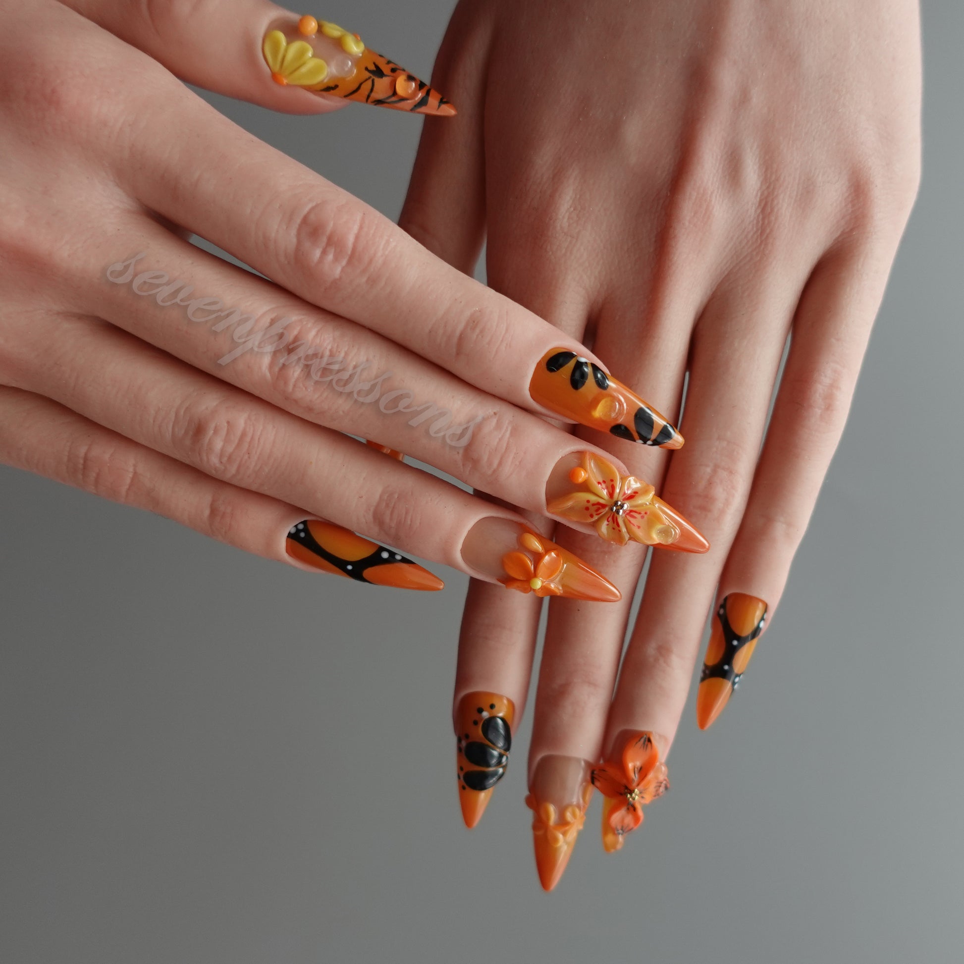 Bold orange gradients blend into translucent nude bases, while dimensional 3D petals, butterfly-wing motifs, and micro-dot detailing create a striking sculptural effect.