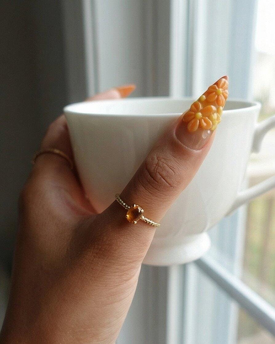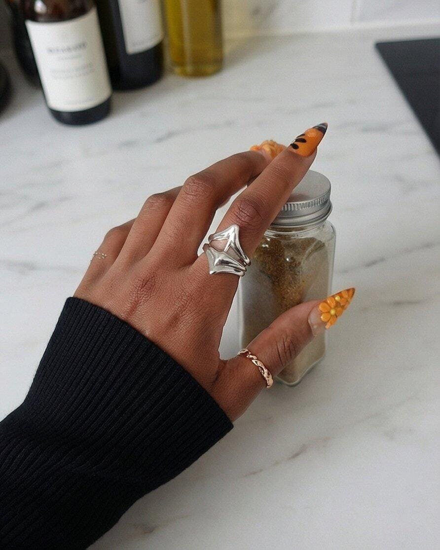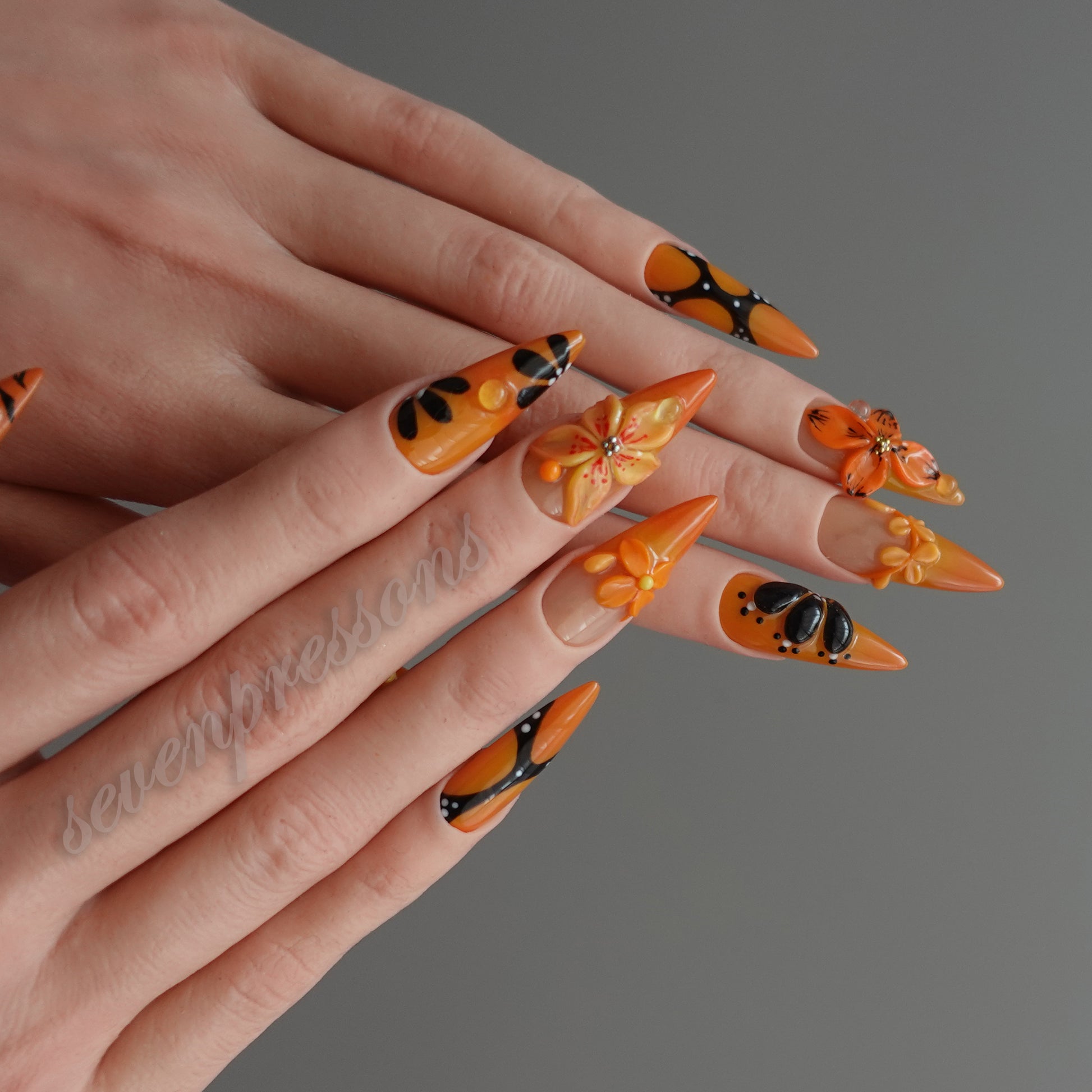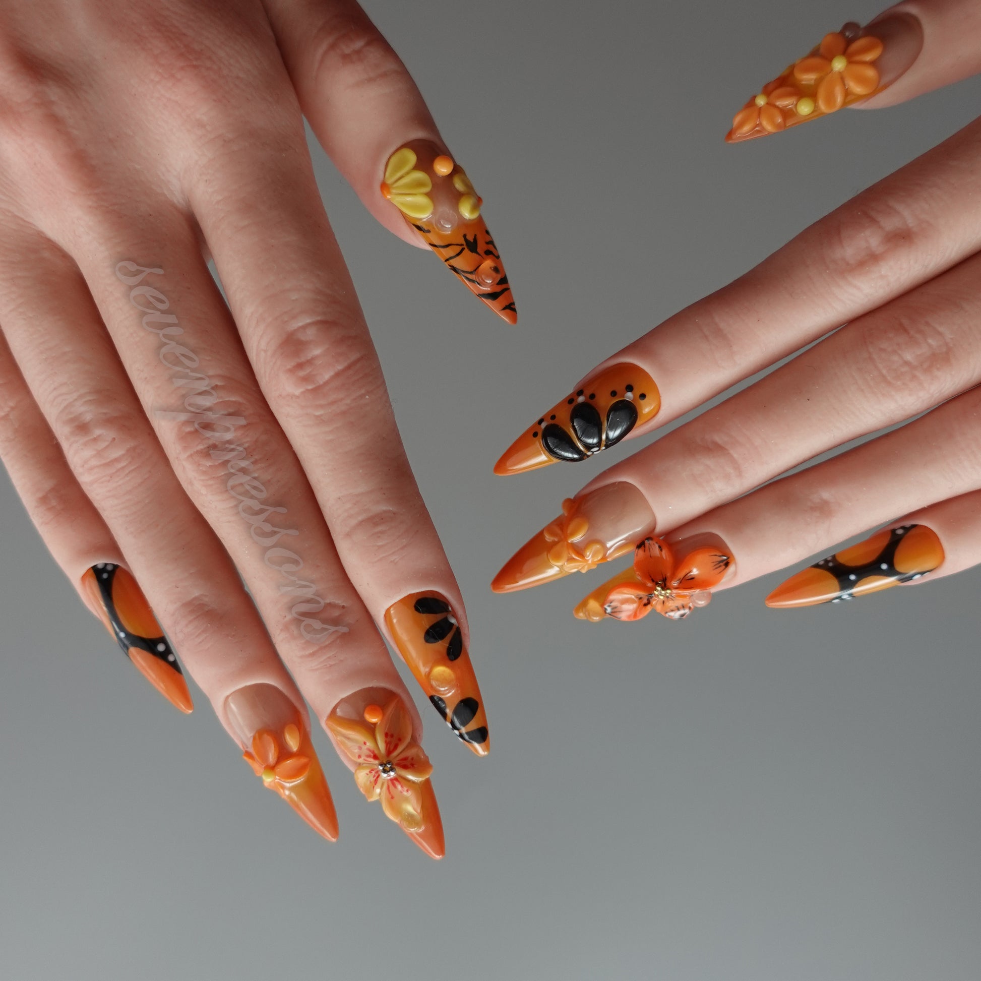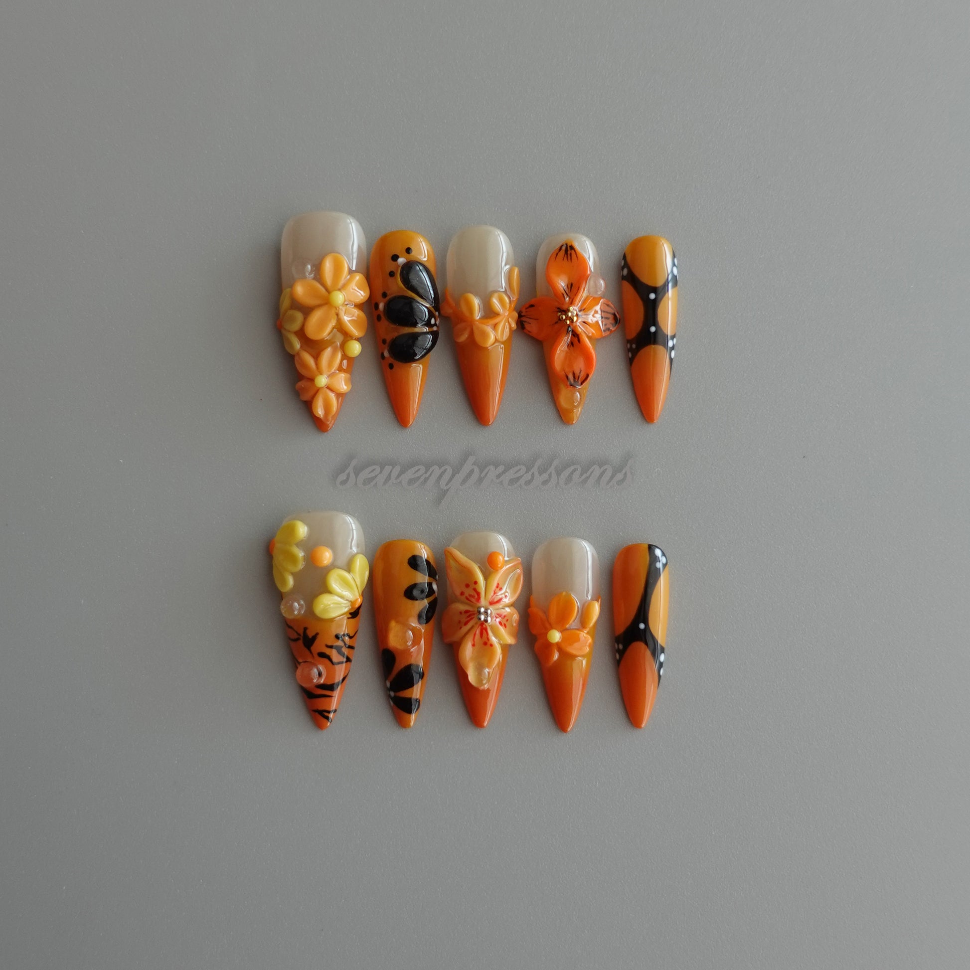 Bold orange gradients blend into translucent nude bases, while dimensional 3D petals, butterfly-wing motifs, and micro-dot detailing create a striking sculptural effect.