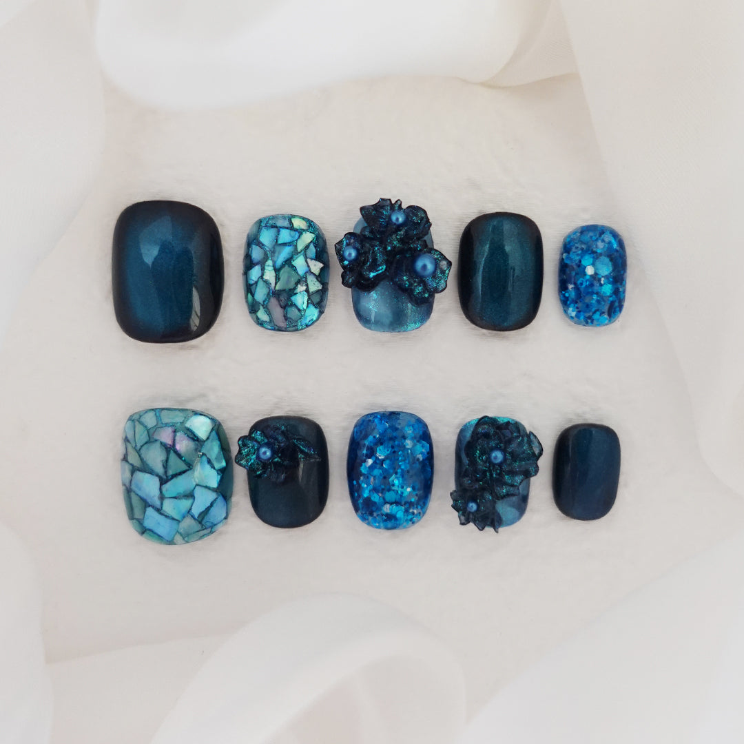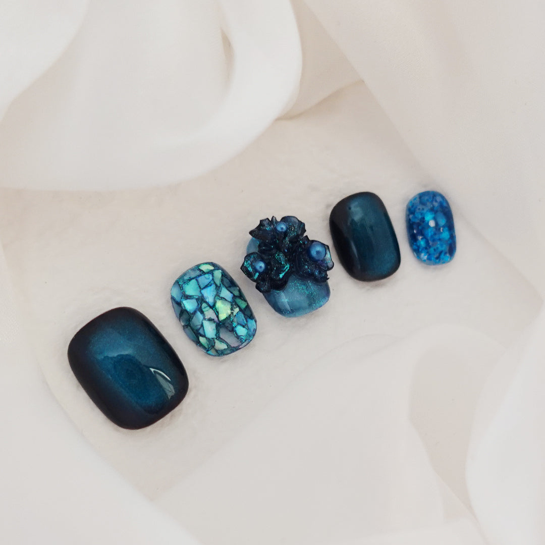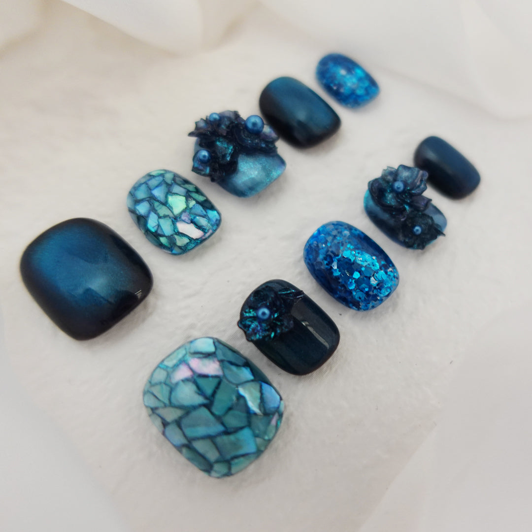 Dive into the depths with Tideborn Relic, a Seven Treasures original that channels the iridescence of sunken treasure and the mystique of ocean floors. This handcrafted press-on nail set features shimmering shell mosaics, deep sapphire gradients, and intricate 3D coral-like sculptures that gleam with oceanic pearls and gems. Inspired by lost relics of the sea and crafted with meticulous detail, every nail becomes a piece of aquatic enchantment you can wear.