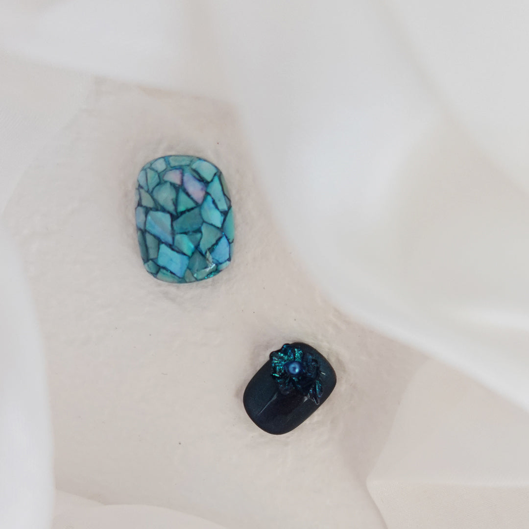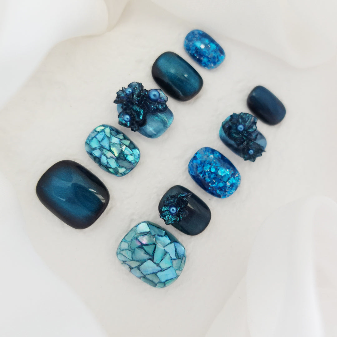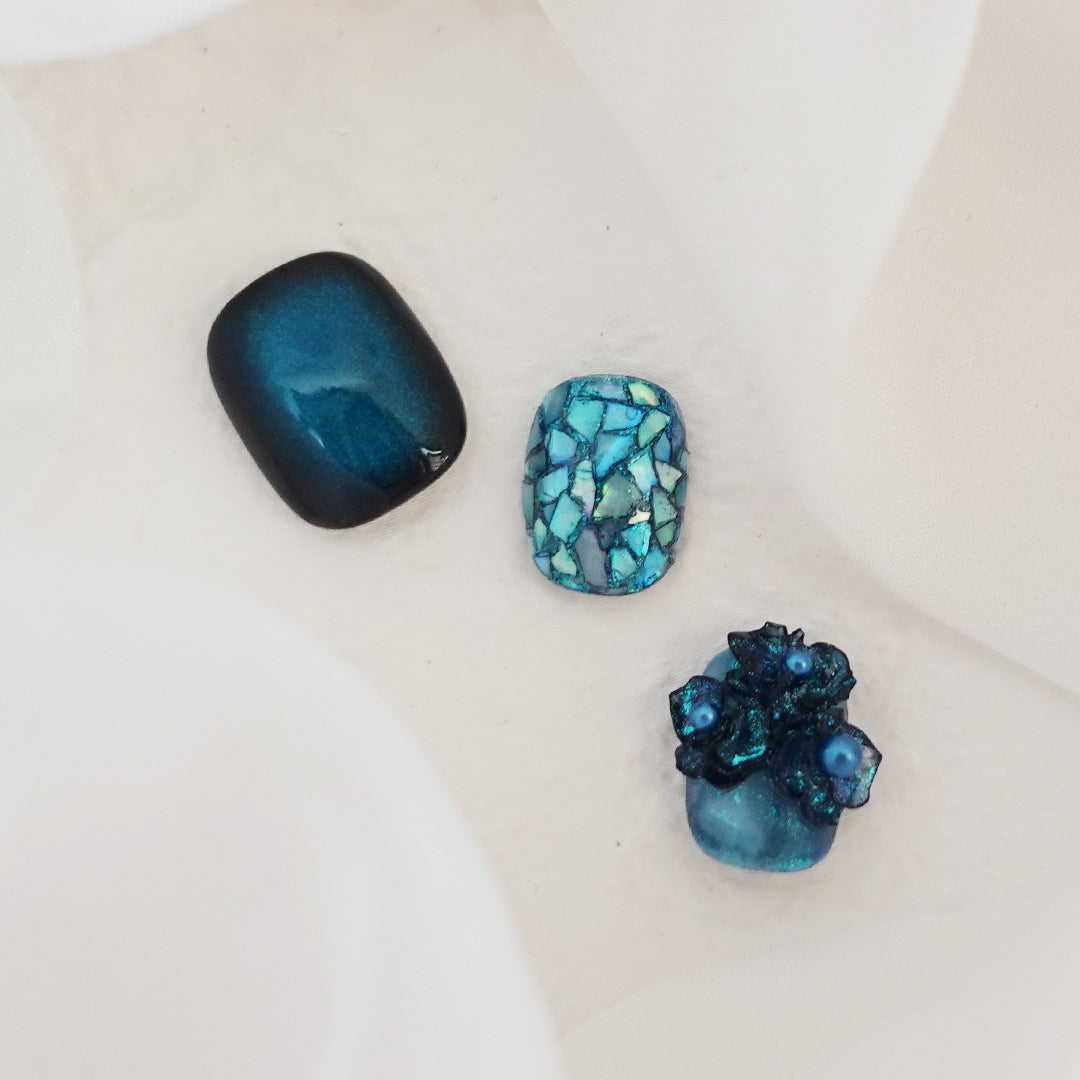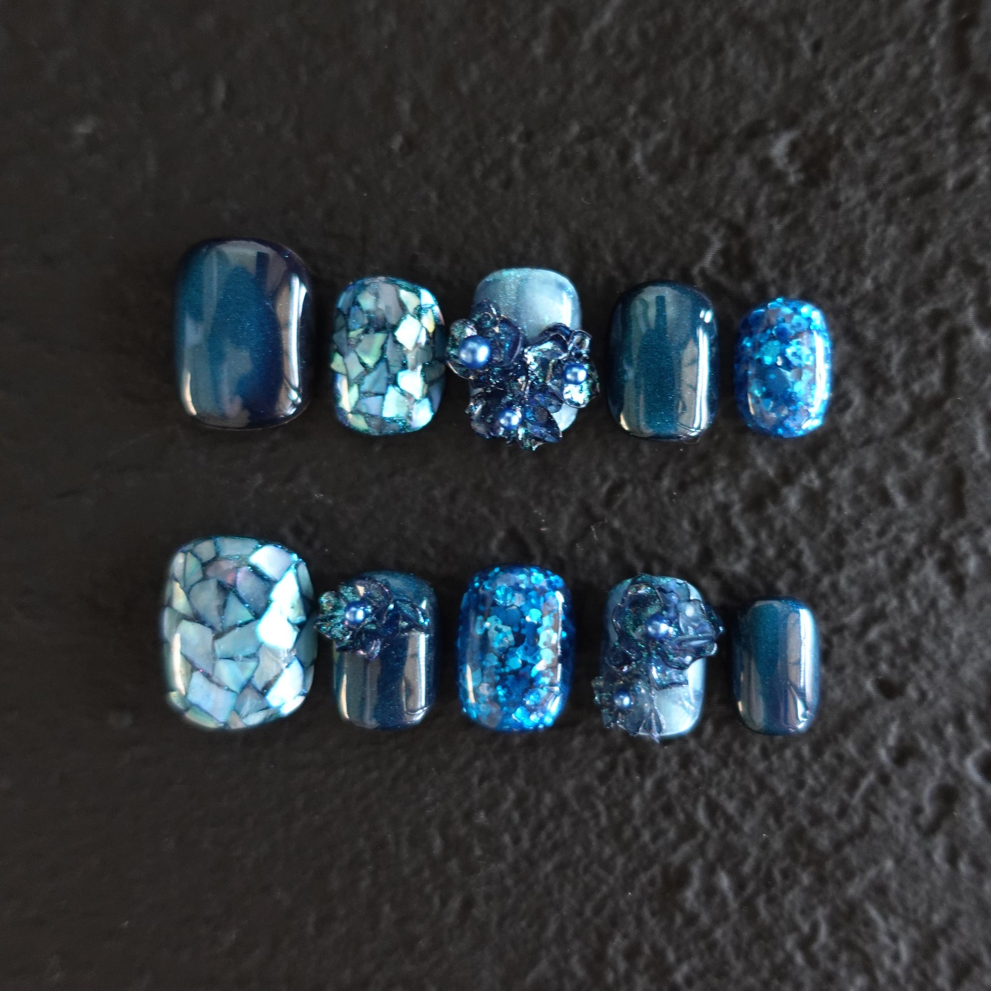 Dive into the depths with Tideborn Relic, a Seven Treasures original that channels the iridescence of sunken treasure and the mystique of ocean floors. This handcrafted press-on nail set features shimmering shell mosaics, deep sapphire gradients, and intricate 3D coral-like sculptures that gleam with oceanic pearls and gems. Inspired by lost relics of the sea and crafted with meticulous detail, every nail becomes a piece of aquatic enchantment you can wear.