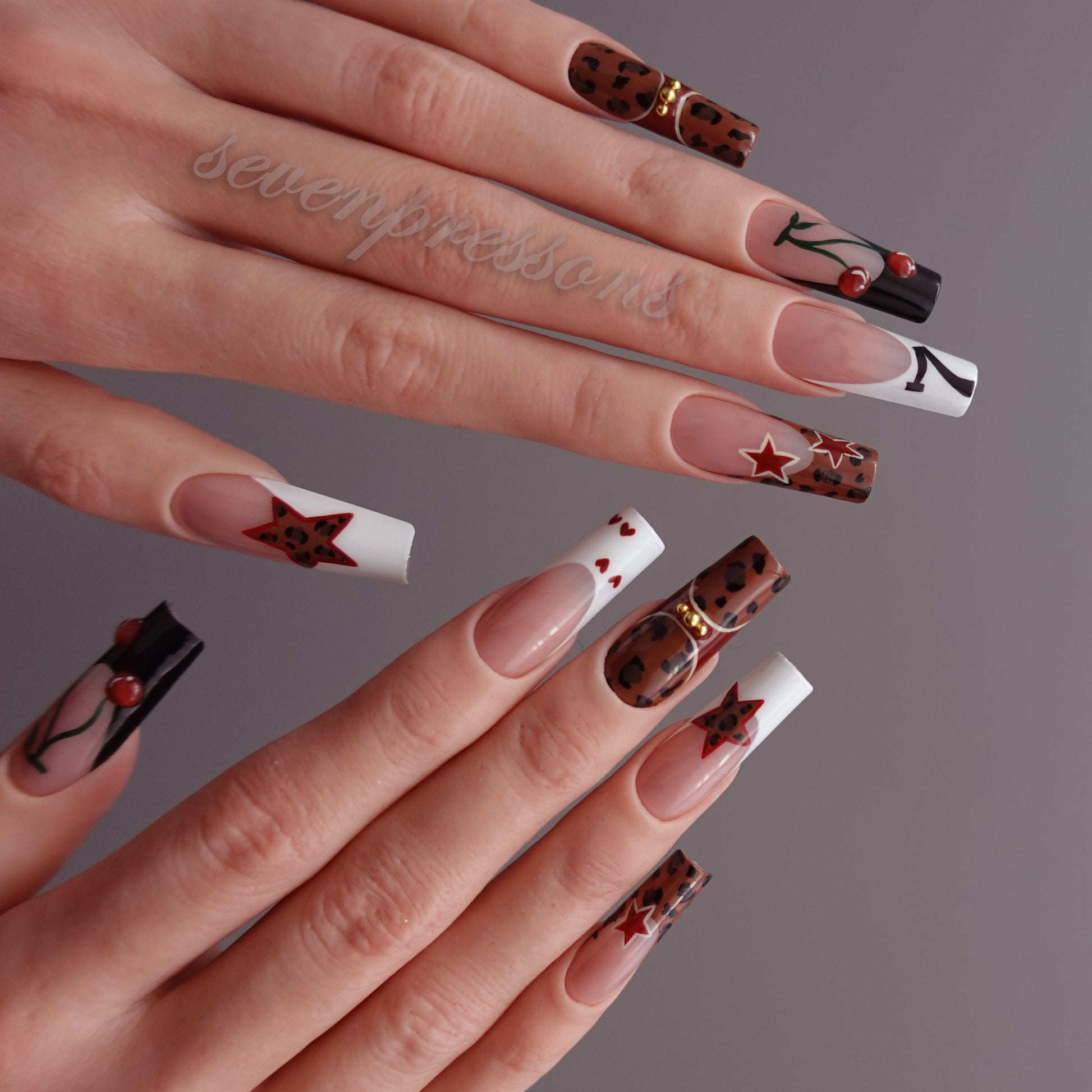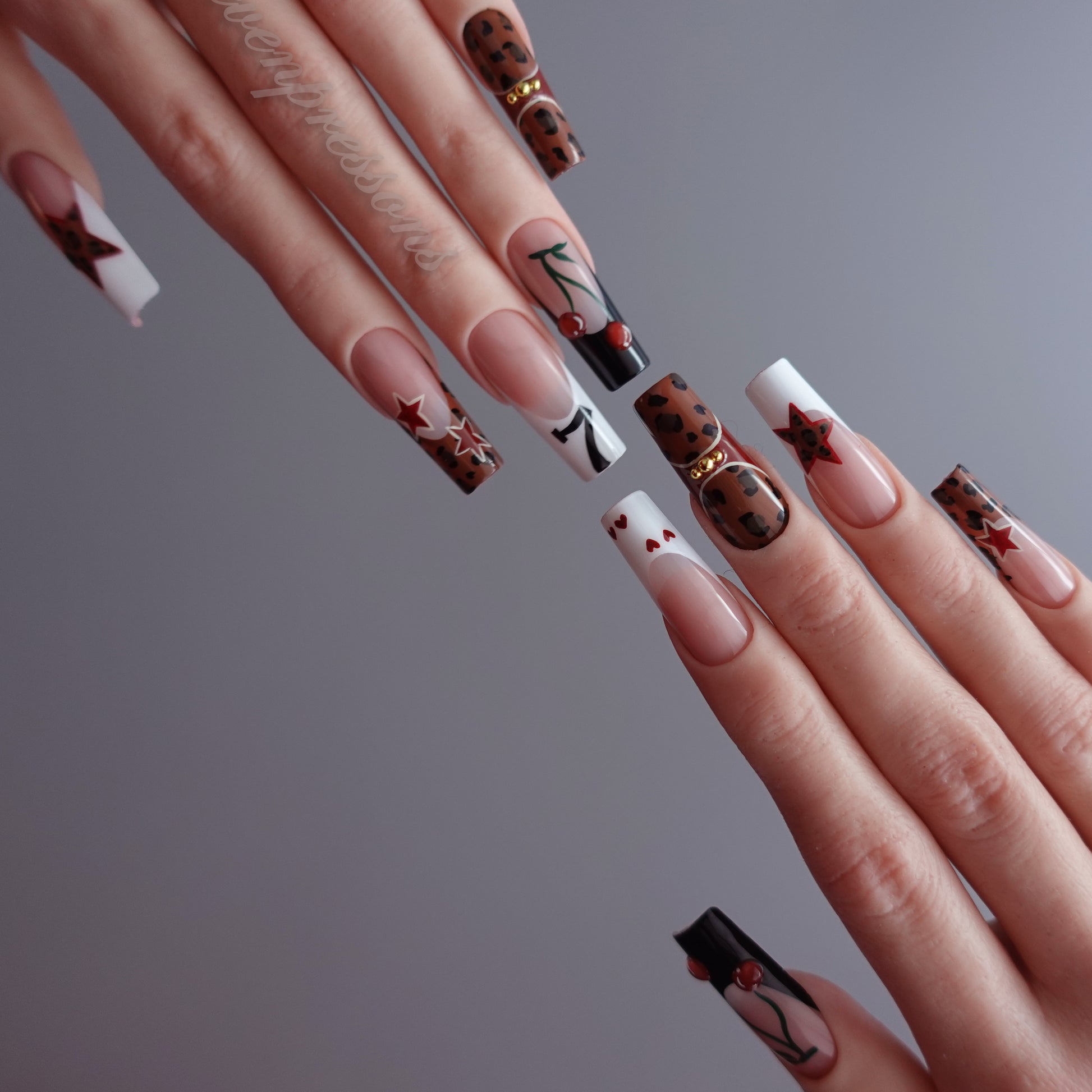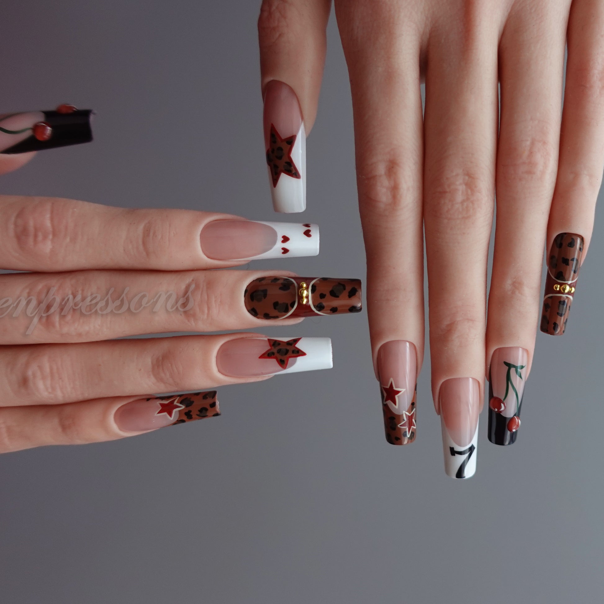 Lucky 7 graphics meet vivid cherries, hand-painted stars, and caramel-brown leopard patterns, all anchored by a soft nude base and crisp white/black contrast. The result is a set that feels adventurous, flirtatious, and unmistakably iconic — a tribute to luck, style, and a little bit of rebellious glamour.