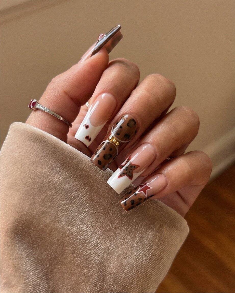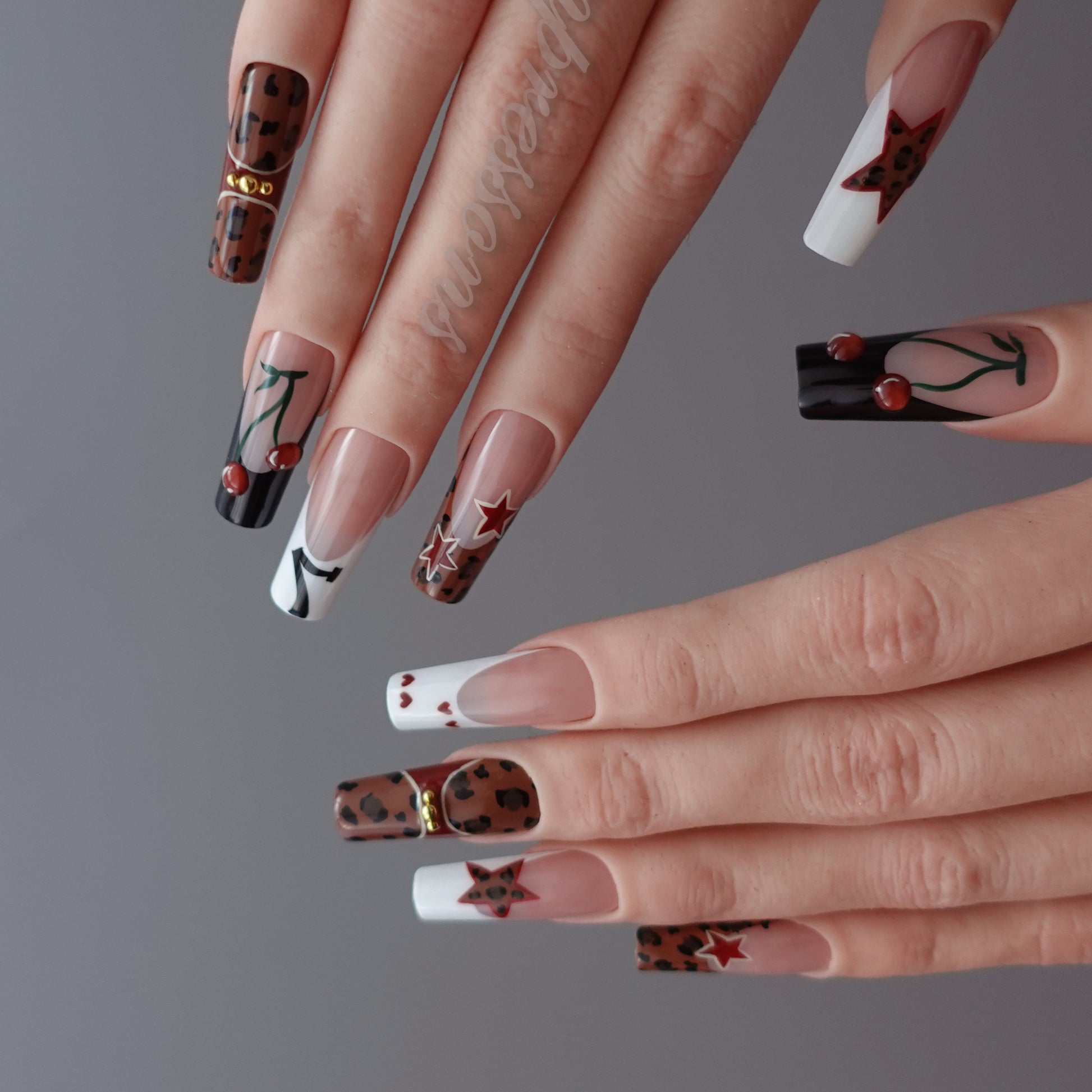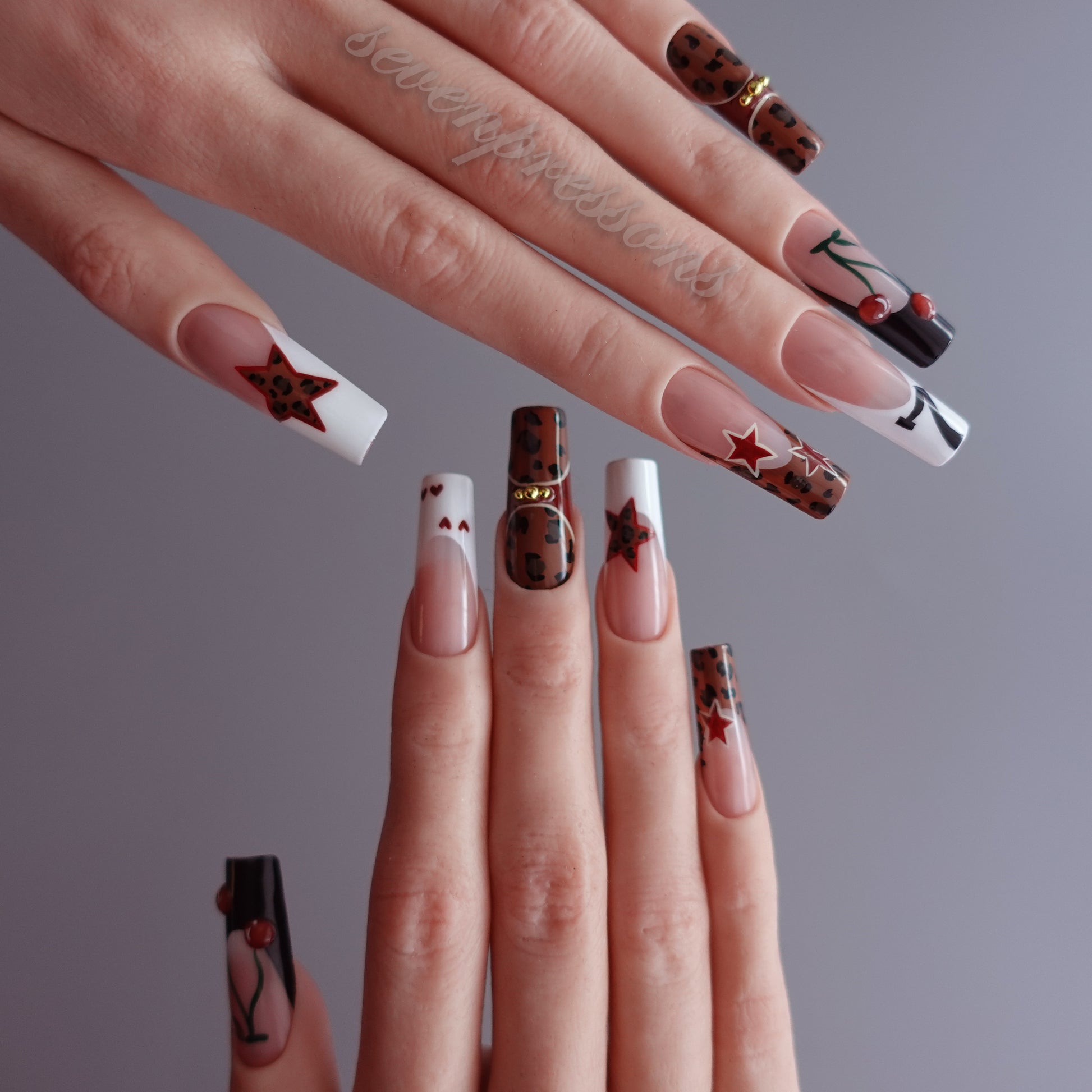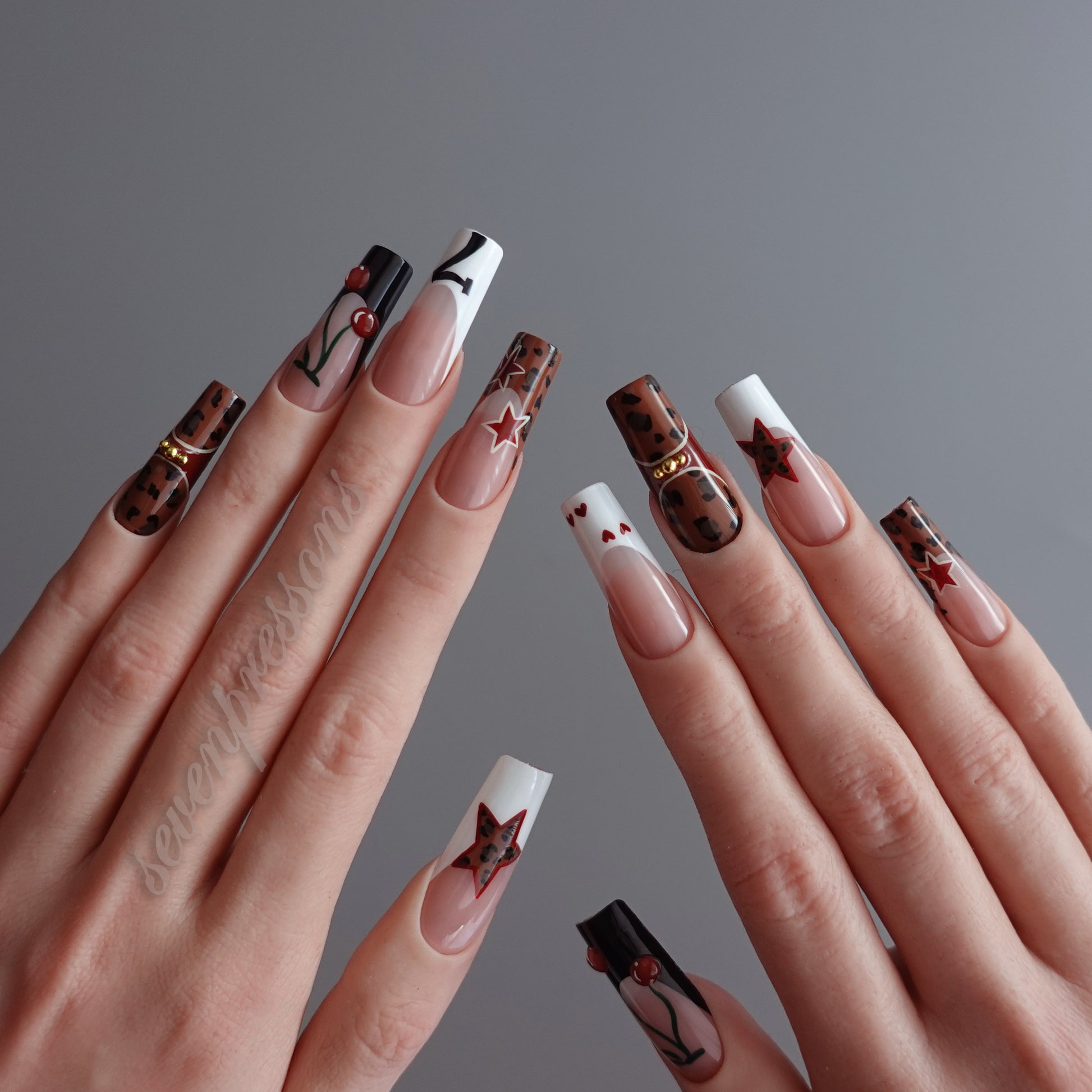 Lucky 7 graphics meet vivid cherries, hand-painted stars, and caramel-brown leopard patterns, all anchored by a soft nude base and crisp white/black contrast. The result is a set that feels adventurous, flirtatious, and unmistakably iconic — a tribute to luck, style, and a little bit of rebellious glamour.